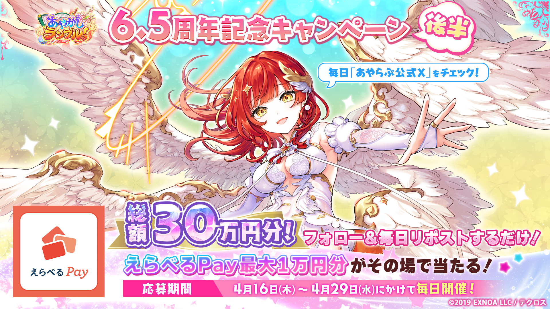 あやらぶ6.5周年を記念して総額30万円!えらべるPay最大1万円分が
